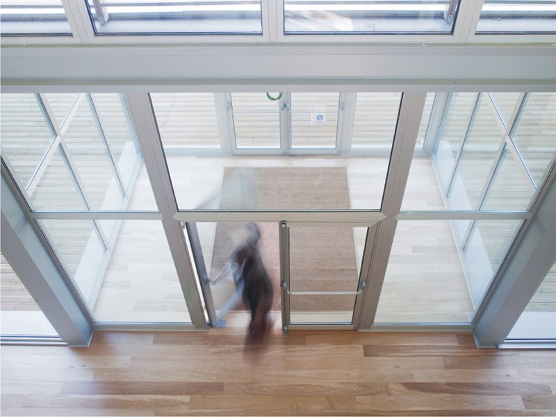 Sistema de puerta peatonal coplanaria de 70 mm de profundidad que garantiza un elevado aislamiento térmico y acústico. -